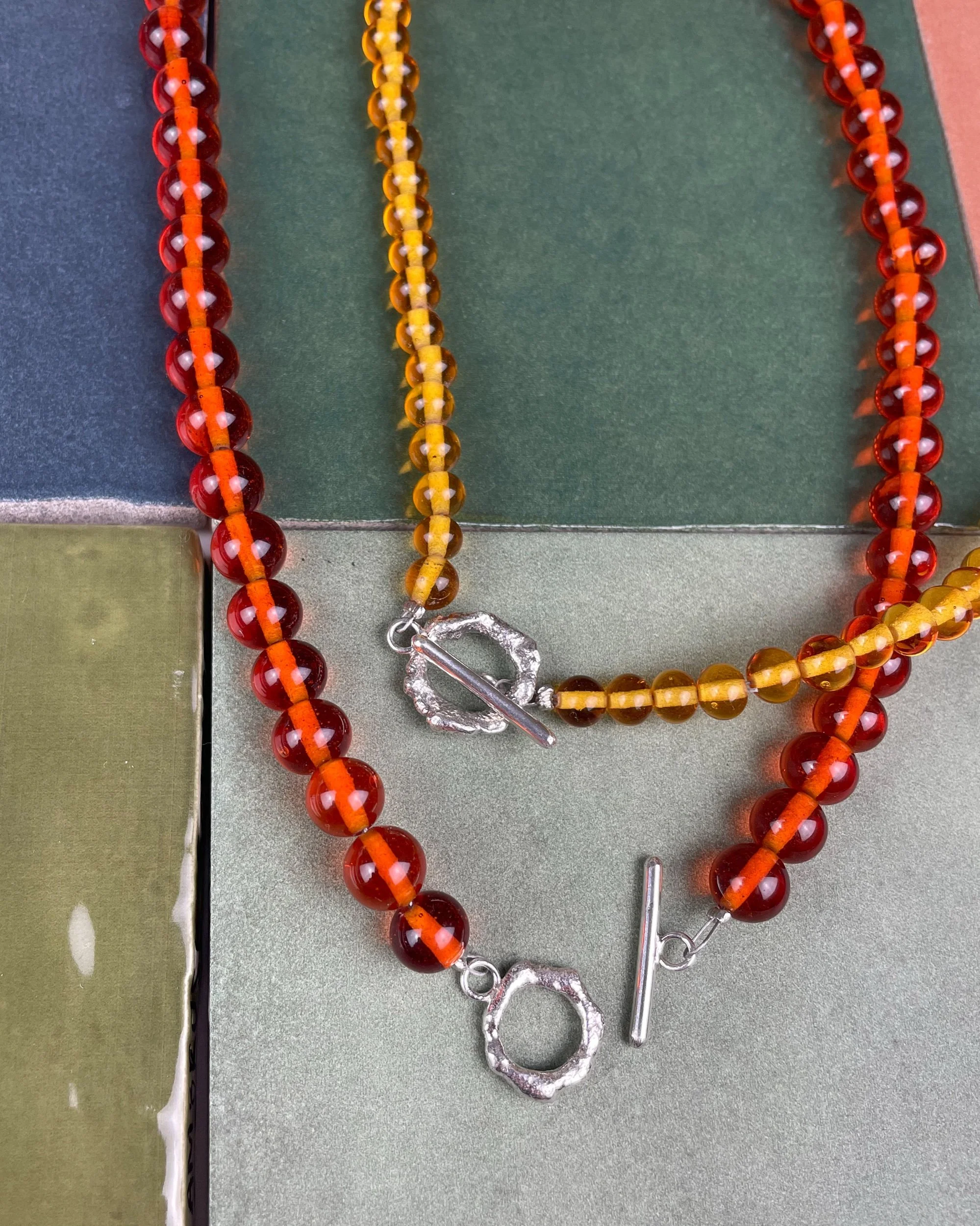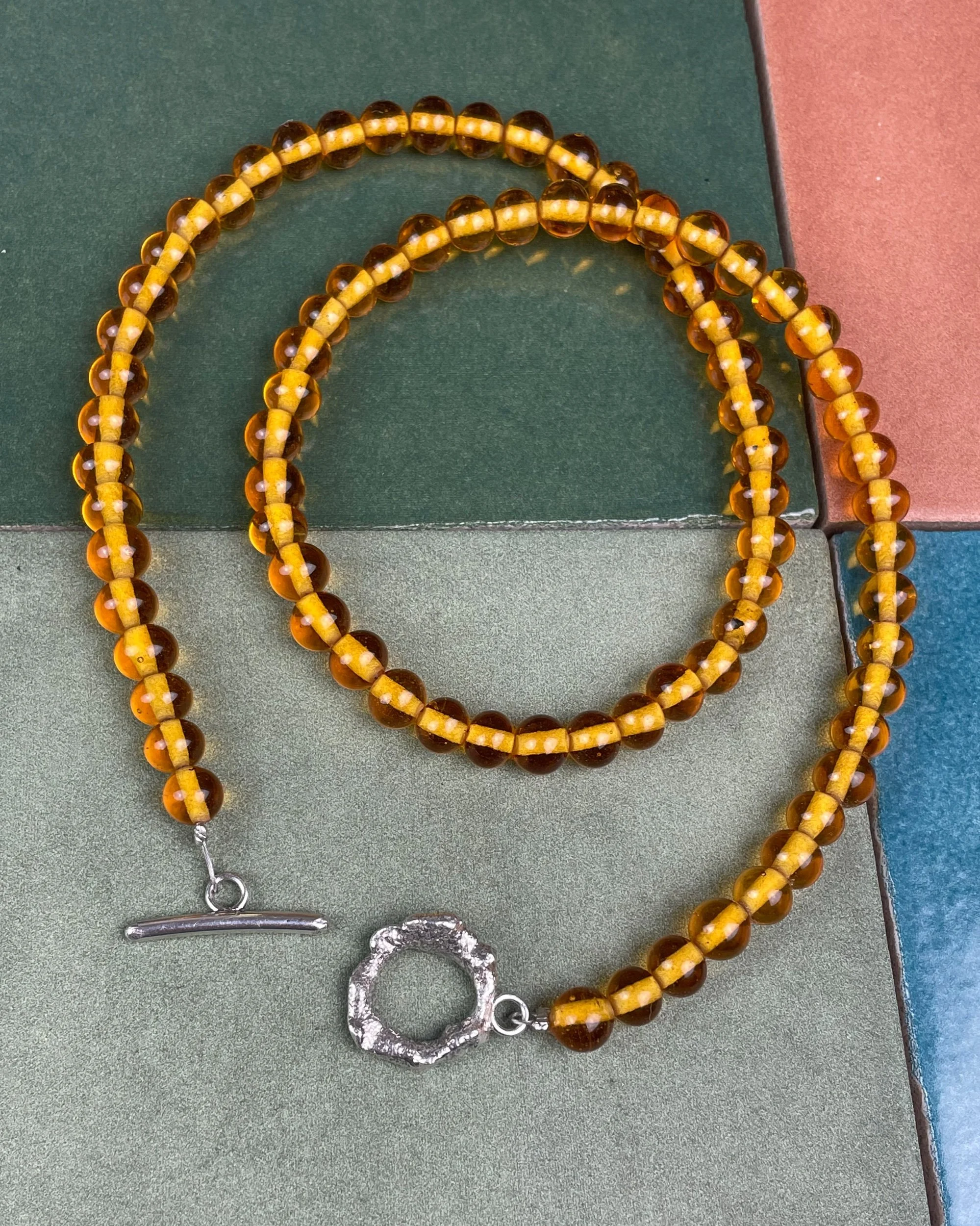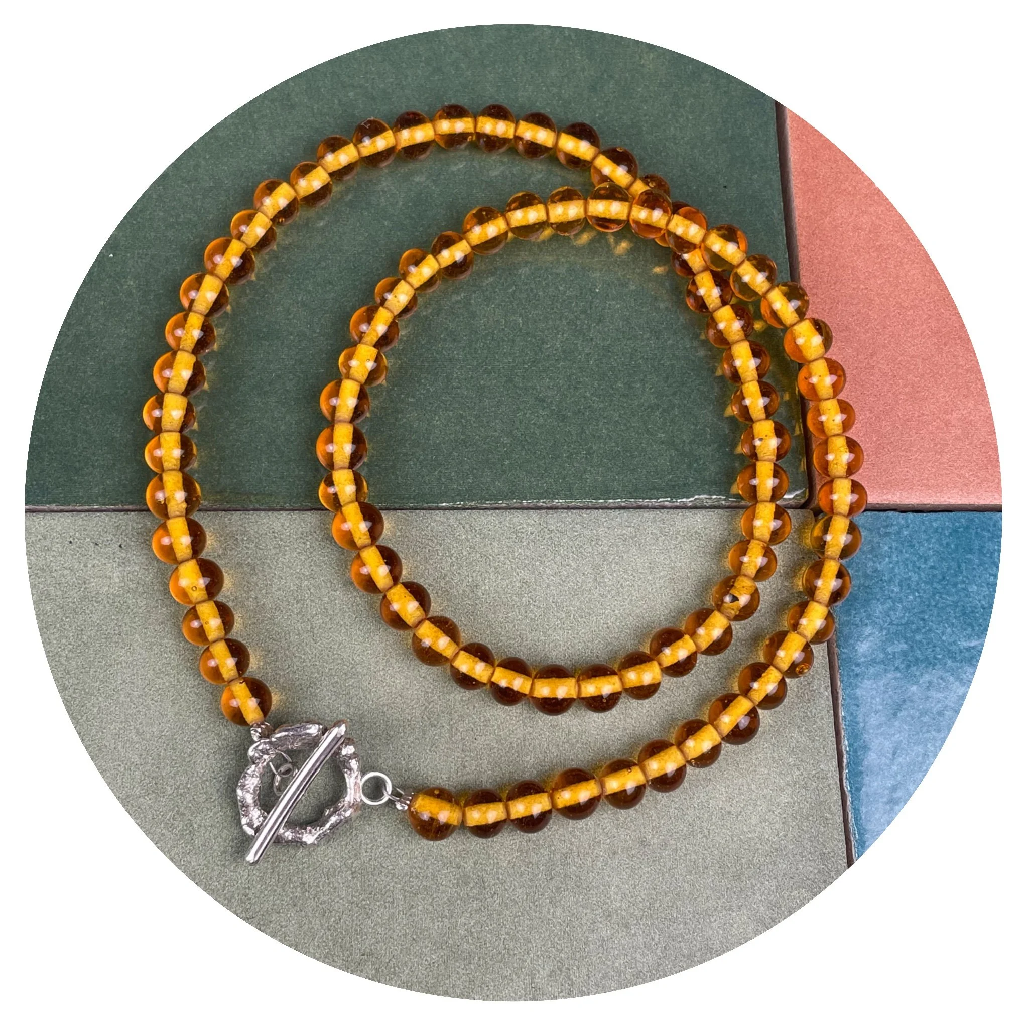 This beautiful beaded necklace features genuine 1950s Japanese glass beads, paired with melted sterling silver toggle. If you’d like a customised length, feel free to get in touch via email or Instagram. I can shorten it or extend it by up to 5cm using my remaining vintage beads.